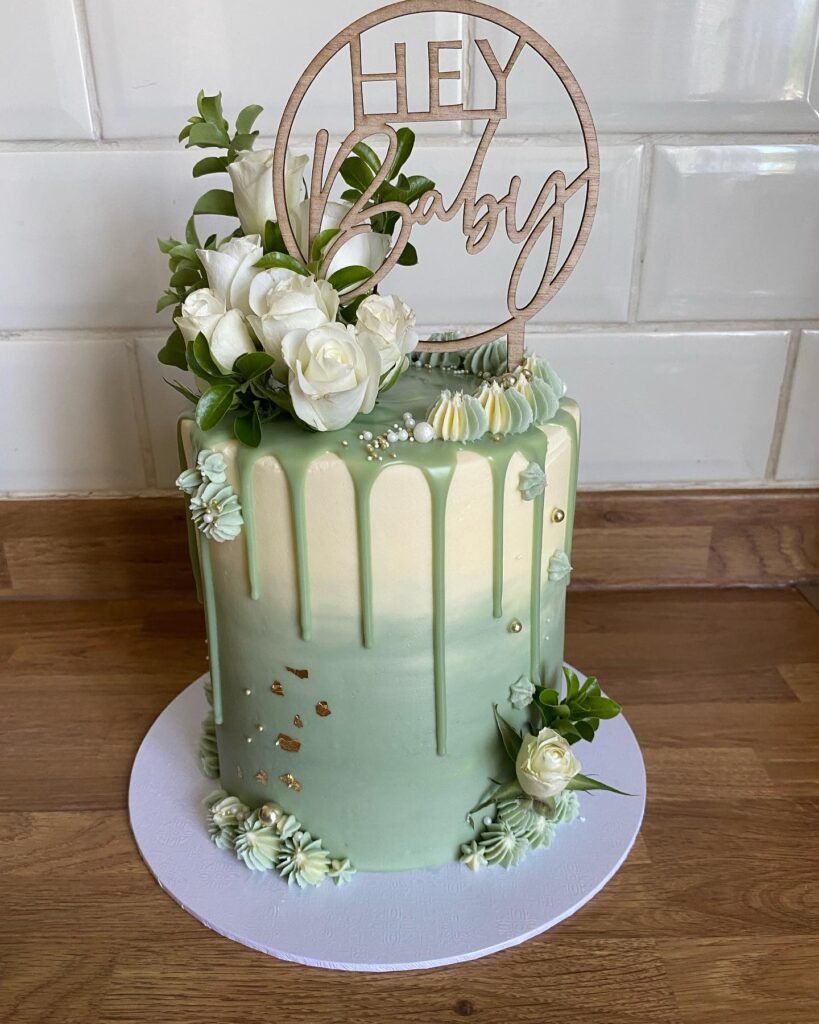 This elegant cake features a sage green ombre effect at the base and a smooth sage green “drip” falling from the top. It is topped with a cluster of fresh white roses and a wooden “Hey Baby” sign. The gold leaf flecks and small pearls scattered on the sides add a touch of sparkle to the organic green tones.