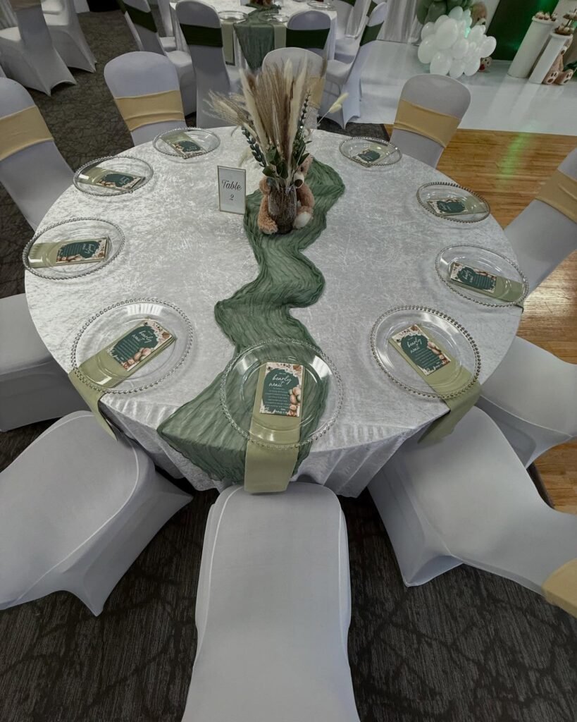 This round guest table features a white textured tablecloth and a long, crinkled sage green fabric runner. Clear beaded chargers hold “Bearly Wait” menus, and a centerpiece of pampas grass and a tiny teddy bear sits in the middle. The use of clear plates allows the sage green napkins and menus to really stand out.