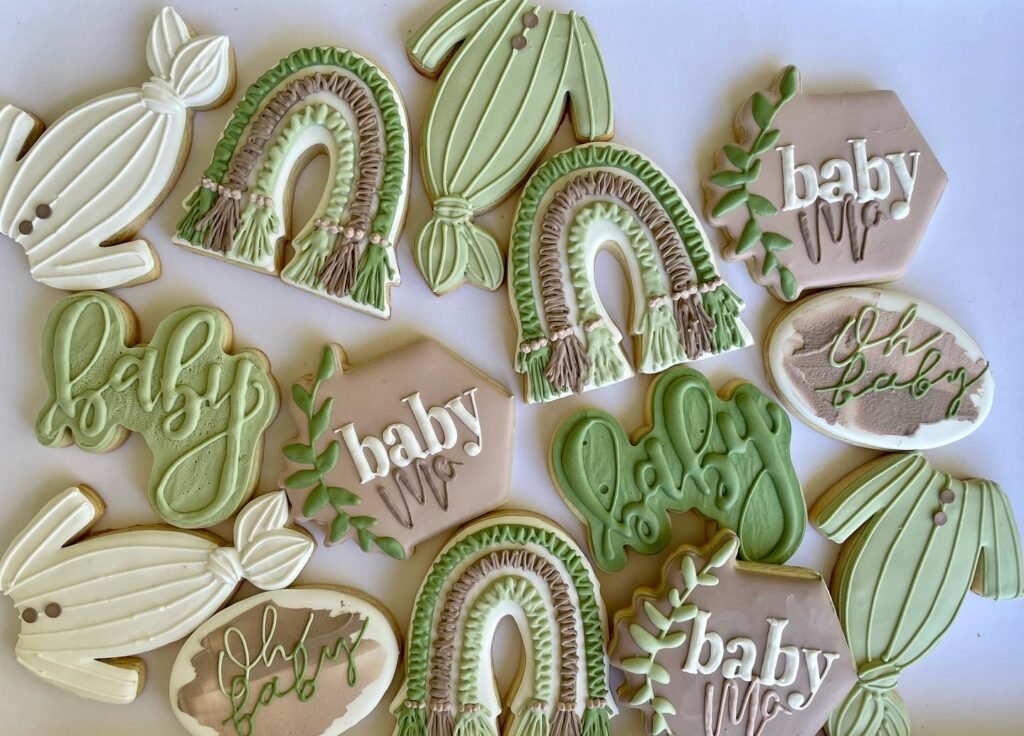 This collection of sugar cookies includes shapes like muted rainbows with tassels, baby onesies, and “Oh Baby” plaques. The colors are a mix of sage, cream, and a dusty rose-brown, perfectly capturing a boho-chic aesthetic. The detailed “stitching” and “texture” on the icing make these almost too pretty to eat.
