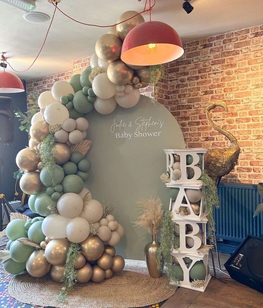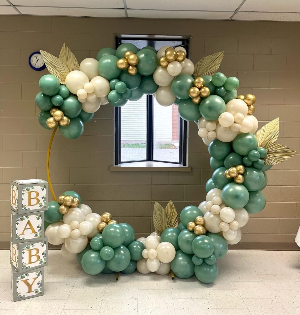 This full-circle balloon arch mixes sage, cream, and gold balloons with dried gold palm spears. Stacks of “BABY” blocks with botanical prints are placed to the side to complete the floor-to-ceiling look. The gold accents provide a needed “pop” against the matte greens, making the whole display feel celebratory and vibrant.