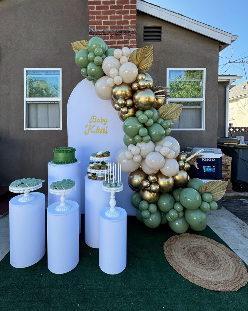 This outdoor setup uses five white cylindrical pedestals of varying heights to display cakes, cookies, and cake pops. A white arched backdrop with gold “Baby Khai” lettering is framed by a giant balloon garland that reaches toward the sky. The clean white pedestals make the green treats and balloons appear very vibrant and organized.