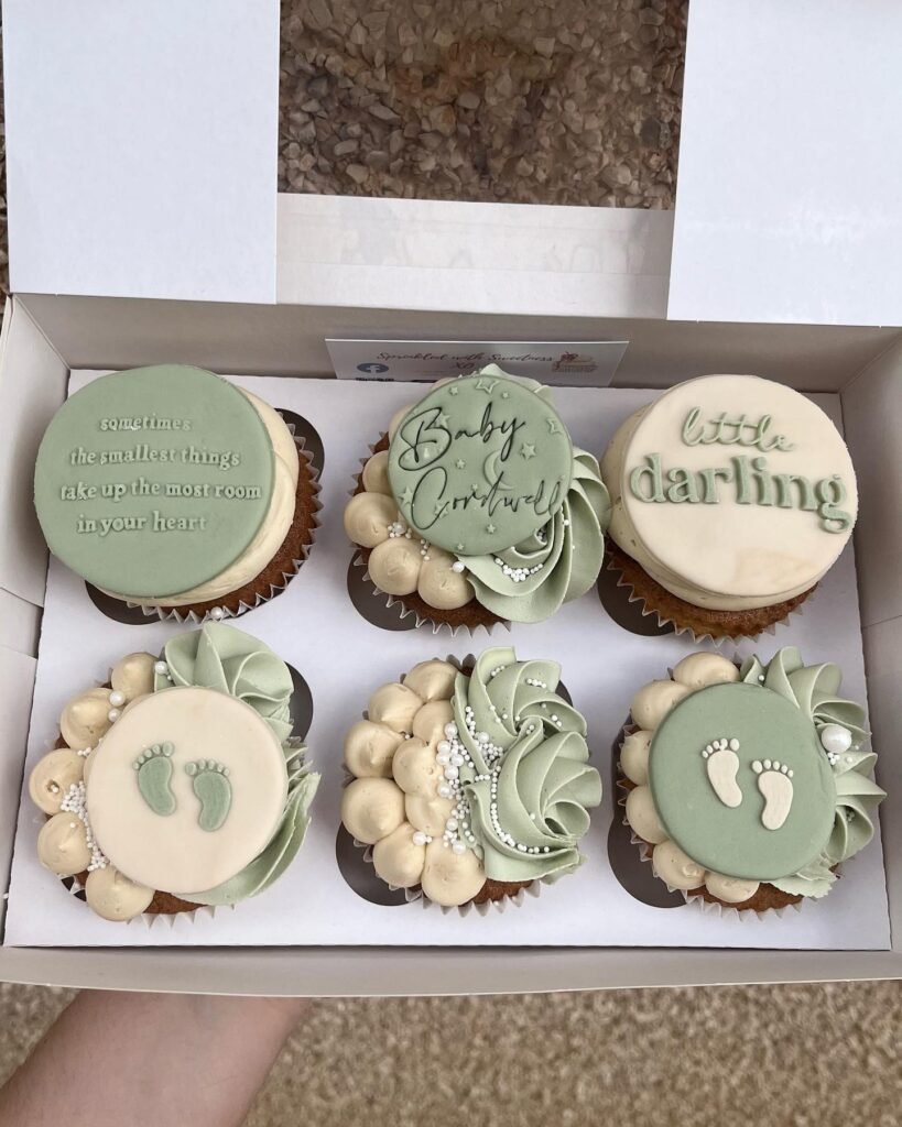This box of six gourmet cupcakes showcases intricate fondant work with sage green and cream frosting. Some treats feature tiny footprints, while others have sweet phrases like “little darling” or the baby’s last name pressed into the icing. The visual appeal comes from the variety of textures, including smooth fondant discs and ruffed buttercream swirls.