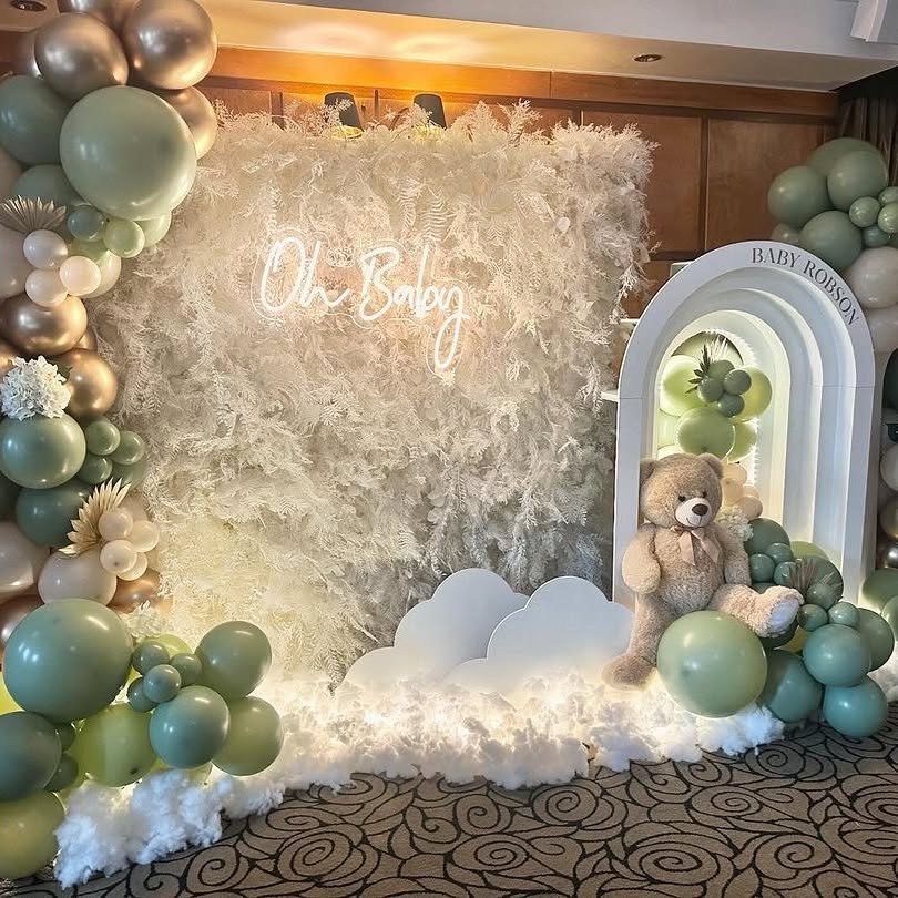 This elaborate setup uses a white textured floral wall as a backdrop for a glowing “Oh Baby” neon sign. Below, fluffy white “clouds” made of batting or cotton rest on the floor alongside a giant plush teddy bear and sage balloon clusters. The layering of the neon light against the soft textures creates a beautiful depth that looks stunning in photos.