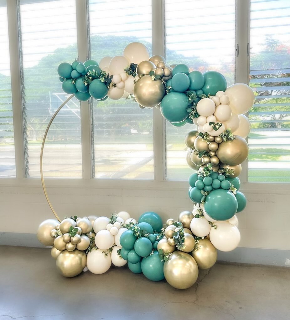 This design features a striking circular gold frame partially draped in a luxurious cluster of balloons in shades of deep teal, cream, and shimmering gold. Small sprigs of white flowers are tucked throughout the arrangement to add a delicate, organic touch against the window light. The use of varying balloon sizes creates a high-end, professional volume that feels architectural rather than just decorative. By leaving part of the gold hoop exposed, the setup feels airy and modern rather than heavy.