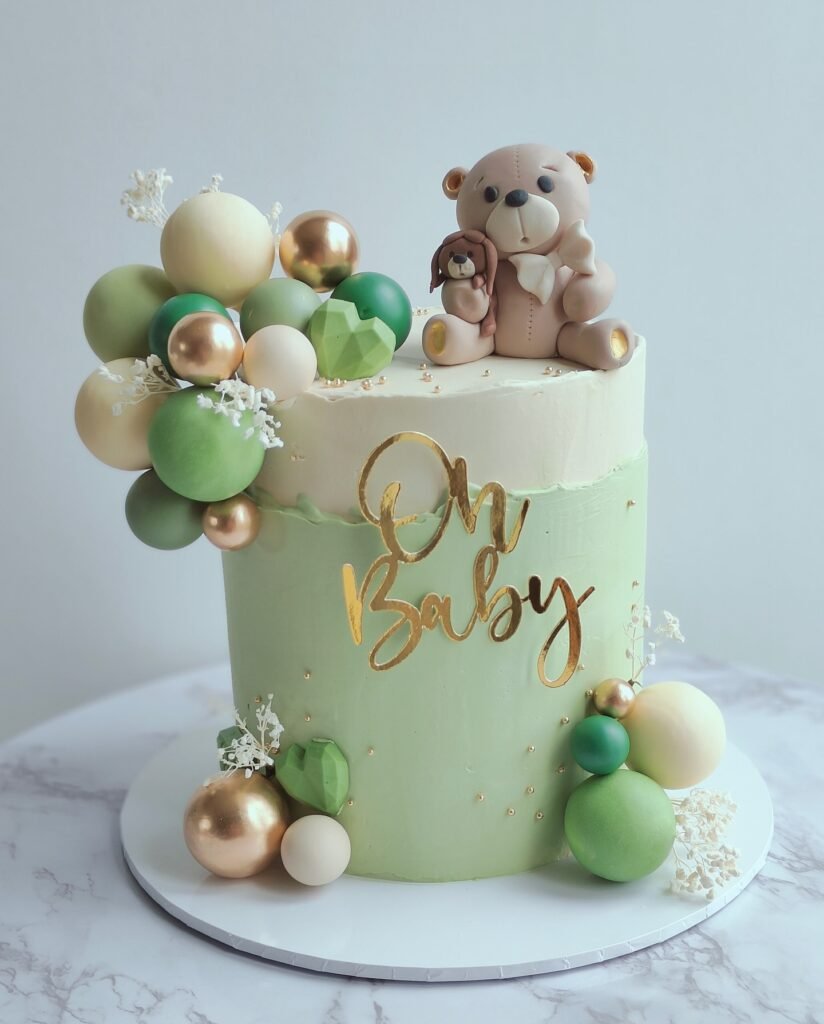This cake features a two-tone effect with a lighter sage top and a deeper green bottom, decorated with gold-toned spheres and a bear topper. Tiny white dried flowers and gold “Oh Baby” lettering add a delicate, feminine touch to the design. The rough, textured “torn” edge between the two colors of frosting adds a modern, artistic flair.