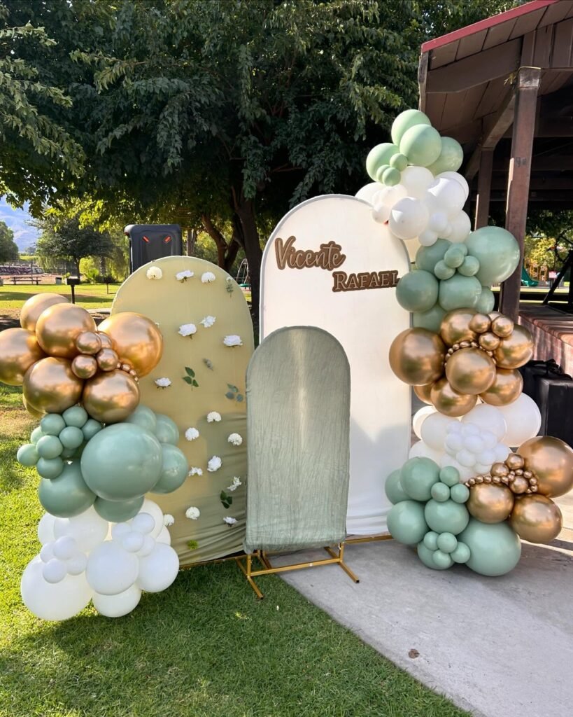 This outdoor display features three staggered arched backdrops in white, sage, and a light olive tone. Clusters of gold, cream, and green balloons are draped over the edges, while white flowers are pinned directly to one of the panels. The varying heights and colors of the panels create a dynamic, layered look that works great against a natural grass background.