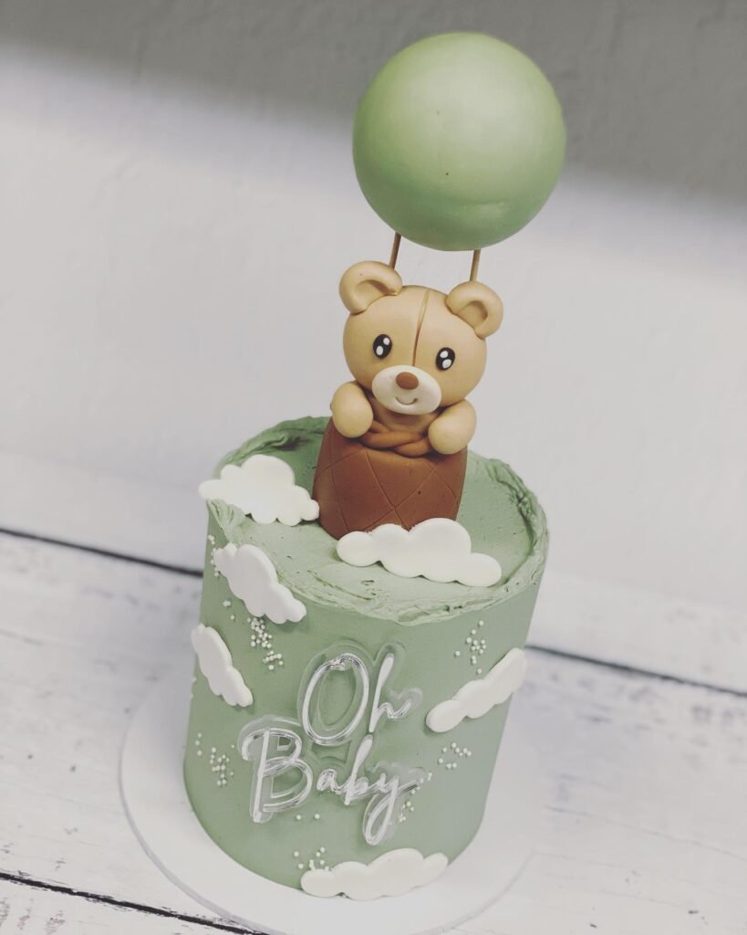 A tall, smooth sage green cake is decorated with white fondant clouds and an adorable teddy bear sitting in a basket. A large green balloon attached to sticks creates the illusion of a hot air balloon floating above the cake. The height of the balloon topper gives the dessert table an immediate “wow” factor.