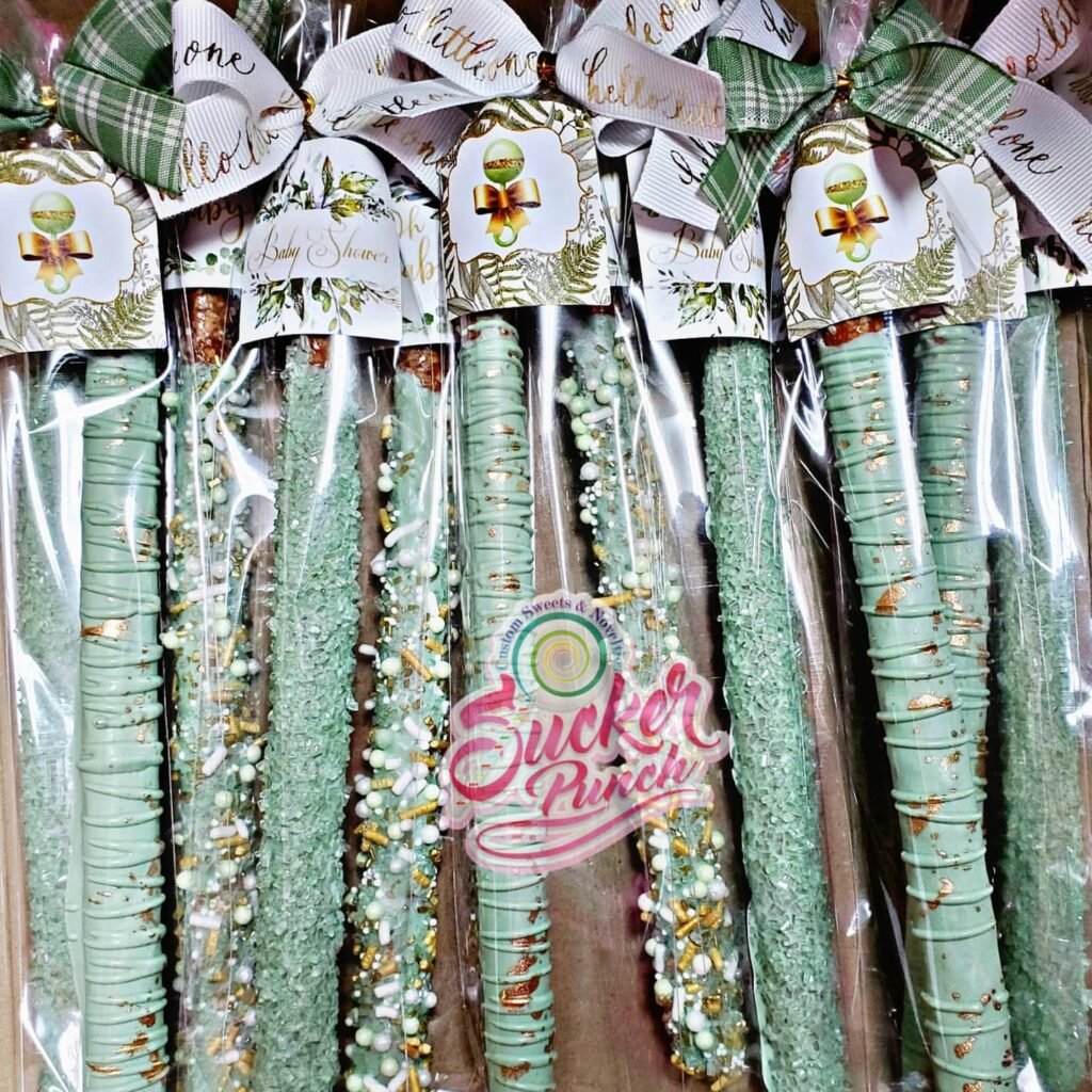 These party favors consist of large pretzel rods dipped in sage green chocolate and drizzled with gold accents. Each one is individually wrapped and tied with a green plaid ribbon and a “Welcome Baby” tag. The combination of the salty-sweet treat and the sophisticated packaging makes for a perfect guest gift.