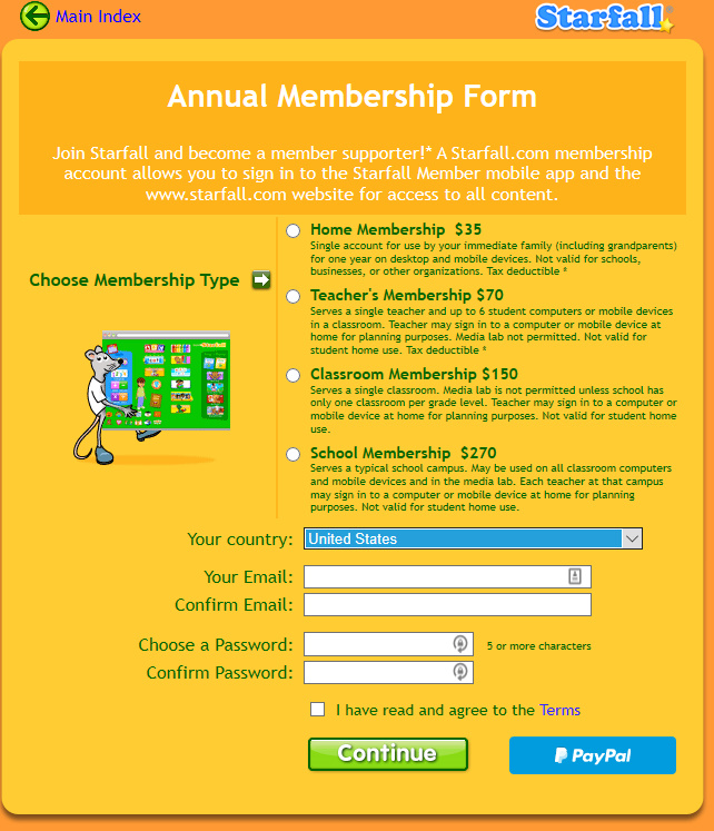 The paid home membership costs 35 dollars per year and unlocks additional reading content and activities. Because Starfall is a non profit, this fee also supports content creation and maintenance.