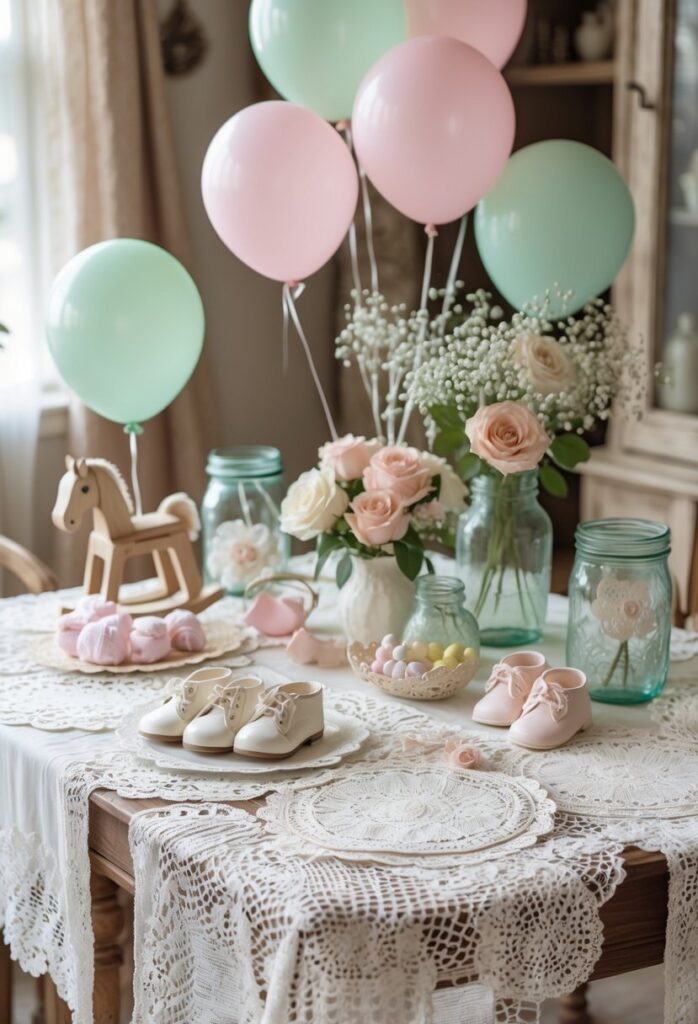 A charming table arrangement features a small wooden rocking horse alongside jars of roses, pastel balloons, and tiny white leather baby shoes. A heavy lace tablecloth serves as the foundation, tying the various textures of wood, leather, and glass together. The floating balloons add a sense of height and celebration to the grounded, rustic elements.