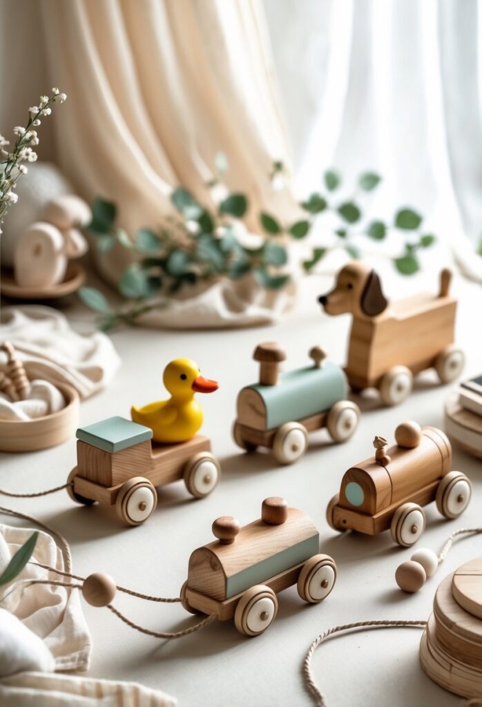 This image focuses on a collection of simple, handcrafted wooden pull-toys, including trains and a little dog. They are set against a backdrop of soft drapes and eucalyptus sprigs, emphasizing a “back to basics” approach to childhood. The natural wood grain and muted paint colors offer a warm, tactile alternative to plastic decor.