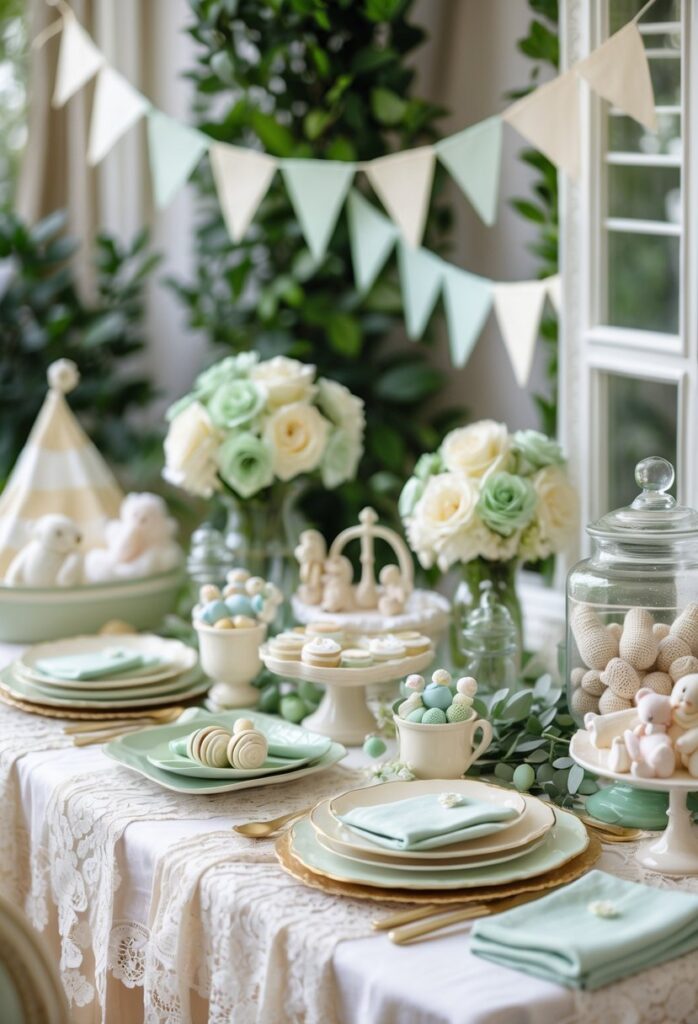 This table is styled with a sage green and cream theme, featuring lace runners, mint-colored plates, and jars filled with knitted textures. Bunting in matching shades hangs above, while fresh white and green roses provide a botanical touch. The monochromatic approach to the green tones keeps the detailed lace from feeling overwhelming.