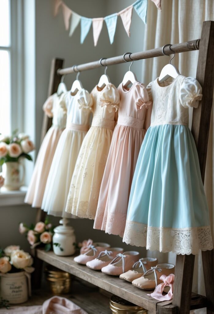 A row of tiny, vintage-style dresses in shades of cream, peach, and baby blue hangs from a rustic wooden clothing rack. Below the dresses, several pairs of soft fabric baby shoes are neatly lined up, accented by delicate lace and silk ribbons. The vertical lines of the hanging dresses create a beautiful visual rhythm that draws the eye across the display.