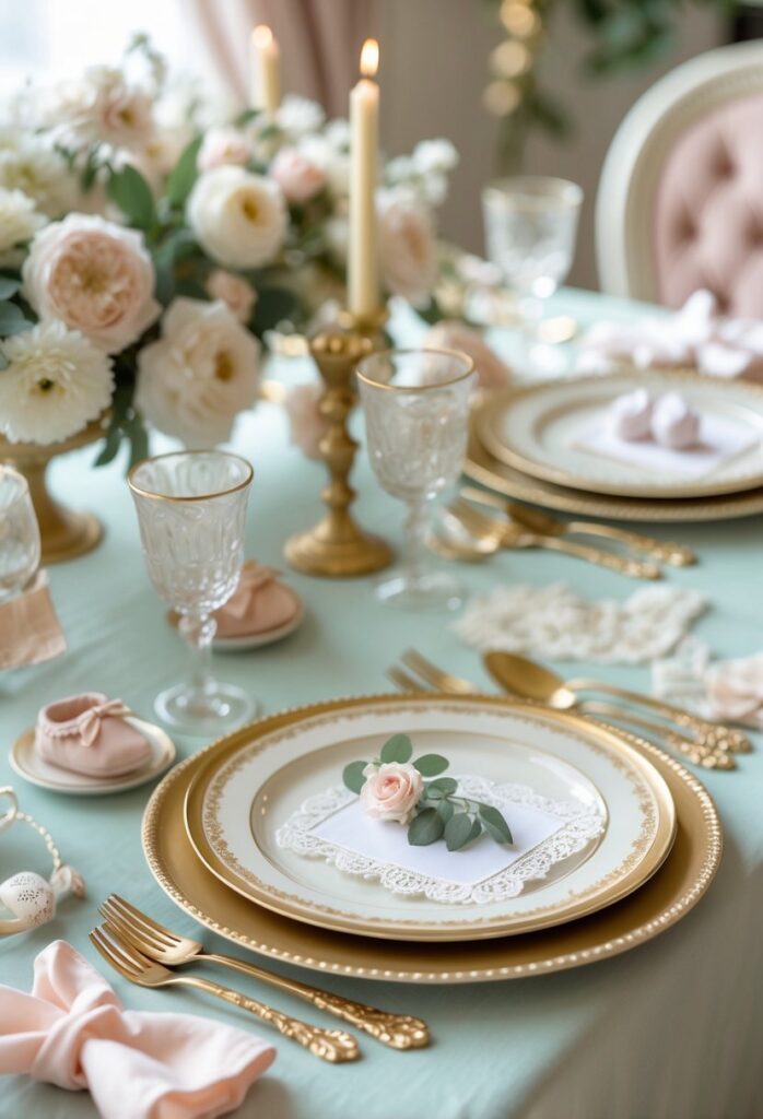 This close-up shows a refined place setting with a mint green tablecloth, gold-rimmed plates, and ornate gold flatware. A single pink rosebud rests on a lace-edged napkin at each seat, and crystal glasses catch the light from nearby candles. The gold accents provide a touch of luxury that elevates the soft pastel palette.