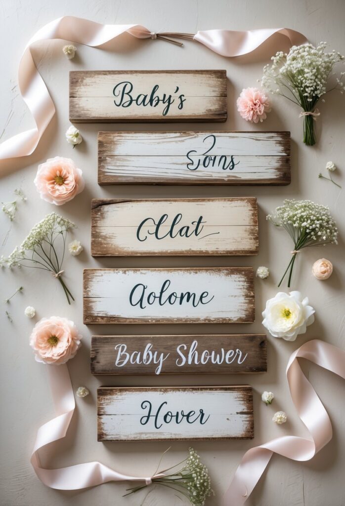 This image displays a beautiful stack of distressed wooden planks featuring elegant, flowing calligraphy. The signs are surrounded by delicate sprigs of baby’s breath, soft pink roses, and a flowing satin ribbon that ties the whole aesthetic together. This design works visually because it balances the rustic, rough texture of the reclaimed wood with the refined, delicate nature of the floral accents.