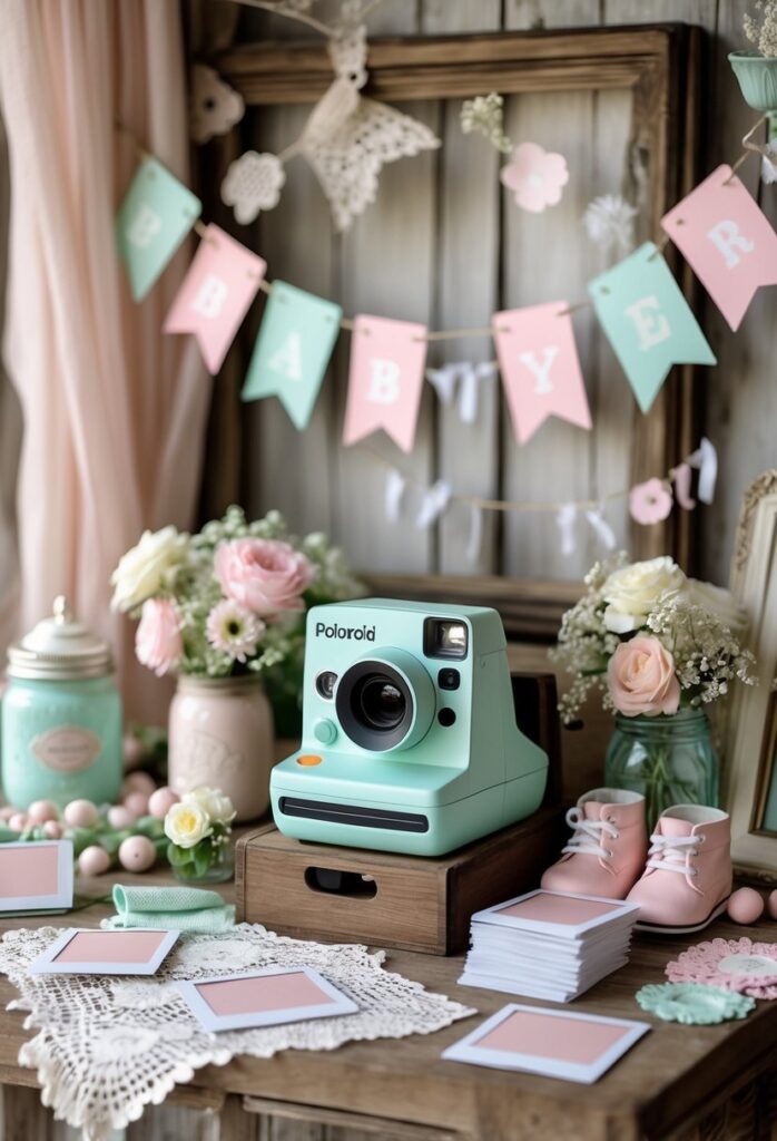 This charming setup features a seafoam green Polaroid camera sitting on a wooden crate, ready to capture instant memories. The background is decorated with a “BABY” bunting in pastel pink and mint, along with mason jars filled with roses and tiny pink baby shoes. The contrast between the modern-retro camera and the rustic lace and wood creates a playful, nostalgic focal point.