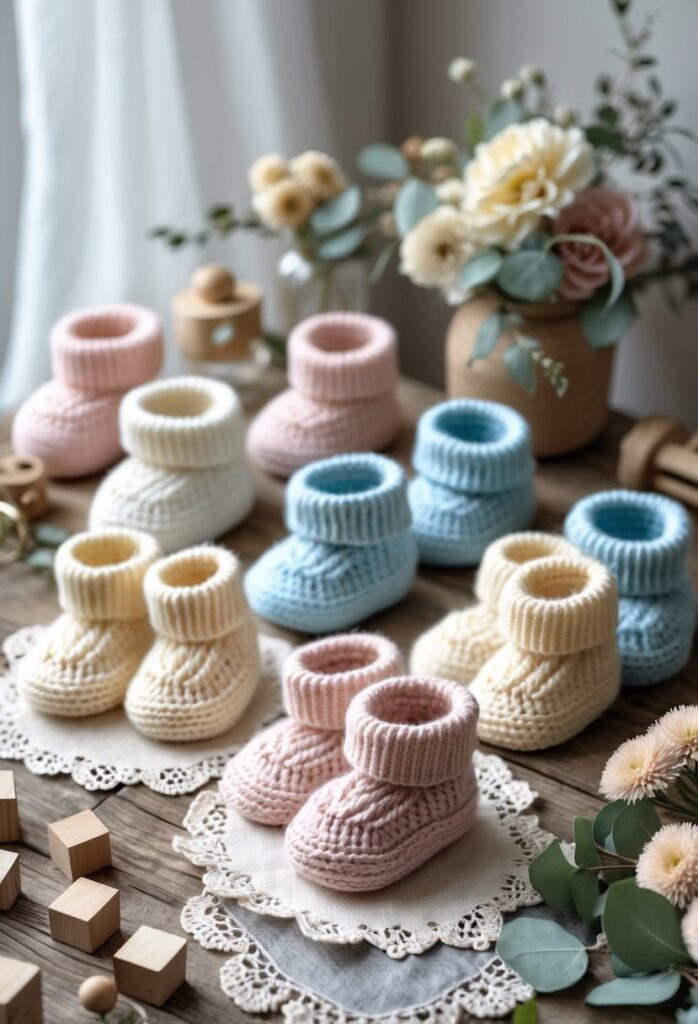 A variety of hand-knitted baby booties in soft pink, cream, and blue are arranged neatly on delicate lace doilies. Beside them are simple wooden blocks and a vase of eucalyptus and roses, providing a mix of soft and organic textures. The repeating patterns of the knitwork against the intricate lace create a very tactile and rich visual experience.