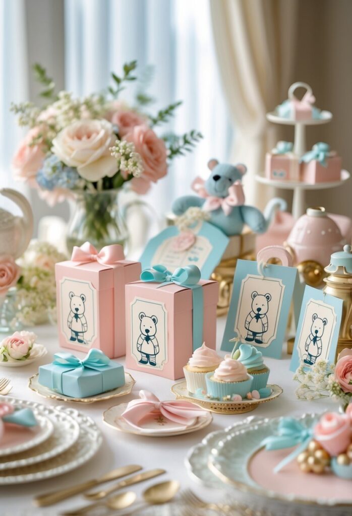 This detailed table setting features pink and blue gift boxes decorated with classic teddy bear illustrations and satin bows. Surrounding the boxes are tiered dessert stands with pastel cupcakes, gold-rimmed plates, and plush blue teddy bears tucked into the decor. The symmetry of the gift boxes provides a structured look that anchors the more whimsical elements of the table.