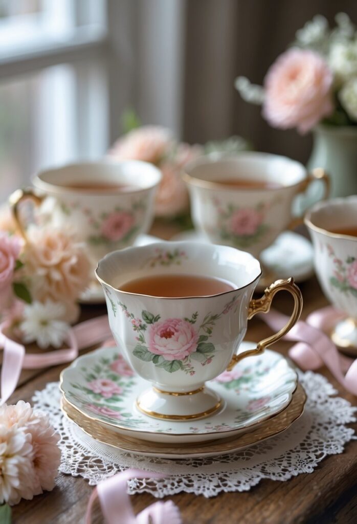 The photo shows a set of exquisite white porcelain tea cups adorned with soft pink rose motifs and glimmering gold rims. They are perched on delicate lace doilies and surrounded by satin ribbons and fresh blooms, creating a quintessential high-tea atmosphere. The repetition of the rose pattern across the saucers and cups creates a sense of harmony and intentionality.